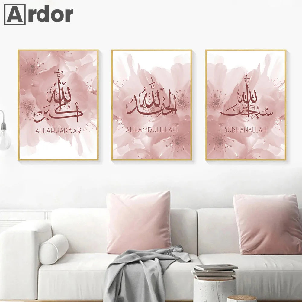 3er-Set: Florale Islamische Wandkunst (Rosa & Gold)
