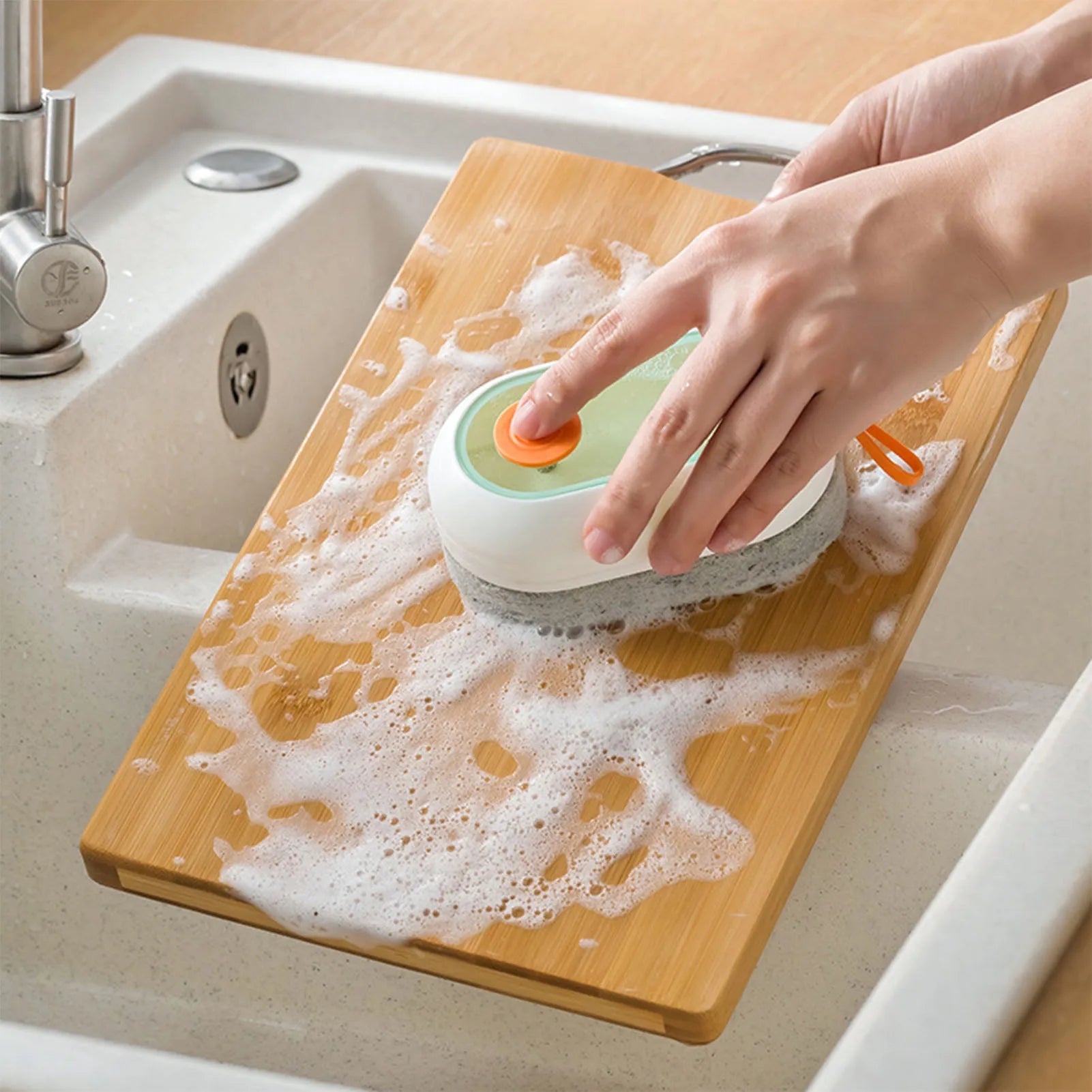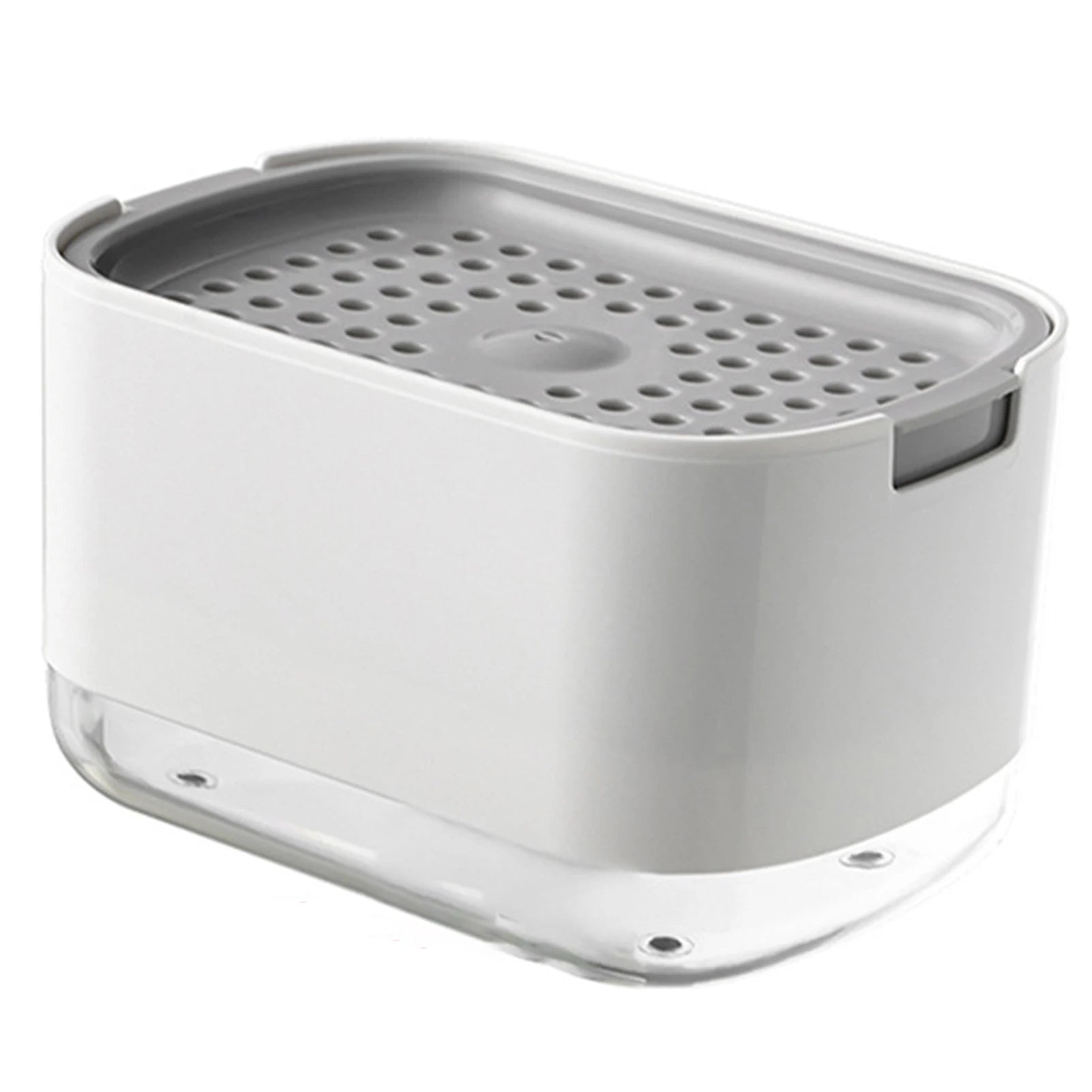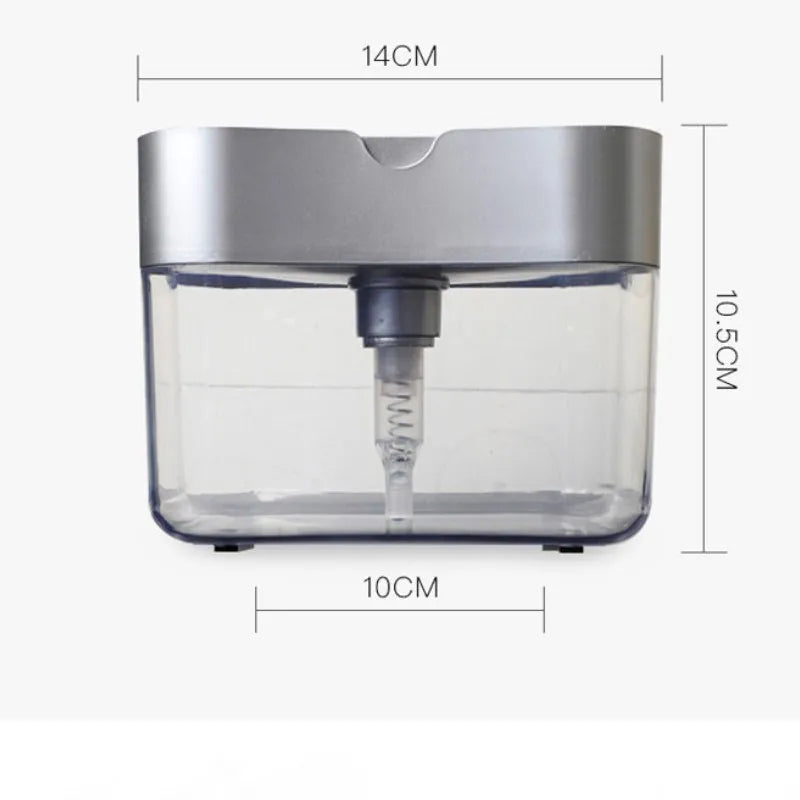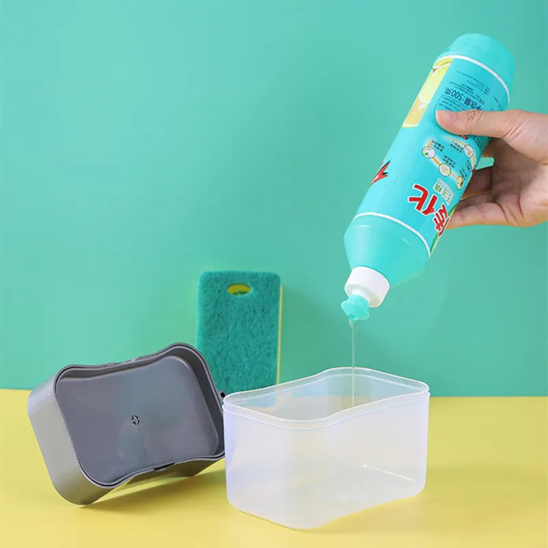 Bequemes 2-in-1 Design: Dieses Produkt vereint die Seifenflüssigkeitsbox mit einem Halter, um den Schwamm griffbereit zu halten. Das Drück-Prinzip (Hand Press) ermöglicht eine automatische und einfache Dosierung des Spülmittels direkt auf den Schwamm.