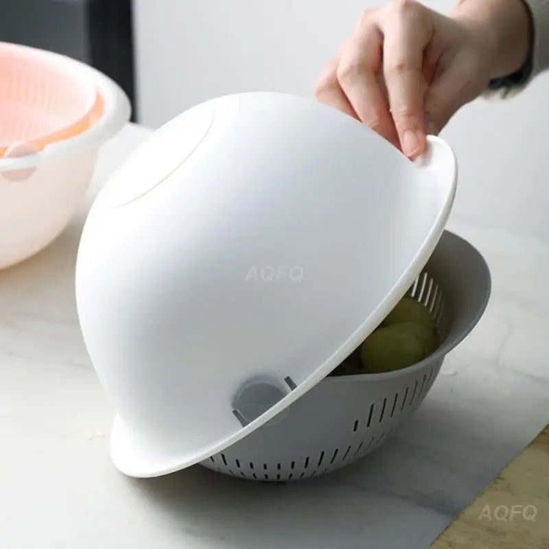 2-in-1 Doppelschicht-Design: Das Set besteht aus einem inneren Siebkorb und einer äußeren Schüssel (Dish Drainer / Colander). Das Sieb kann in der Schüssel gedreht werden, um Wasser abzugießen, während der Inhalt sicher bleibt.