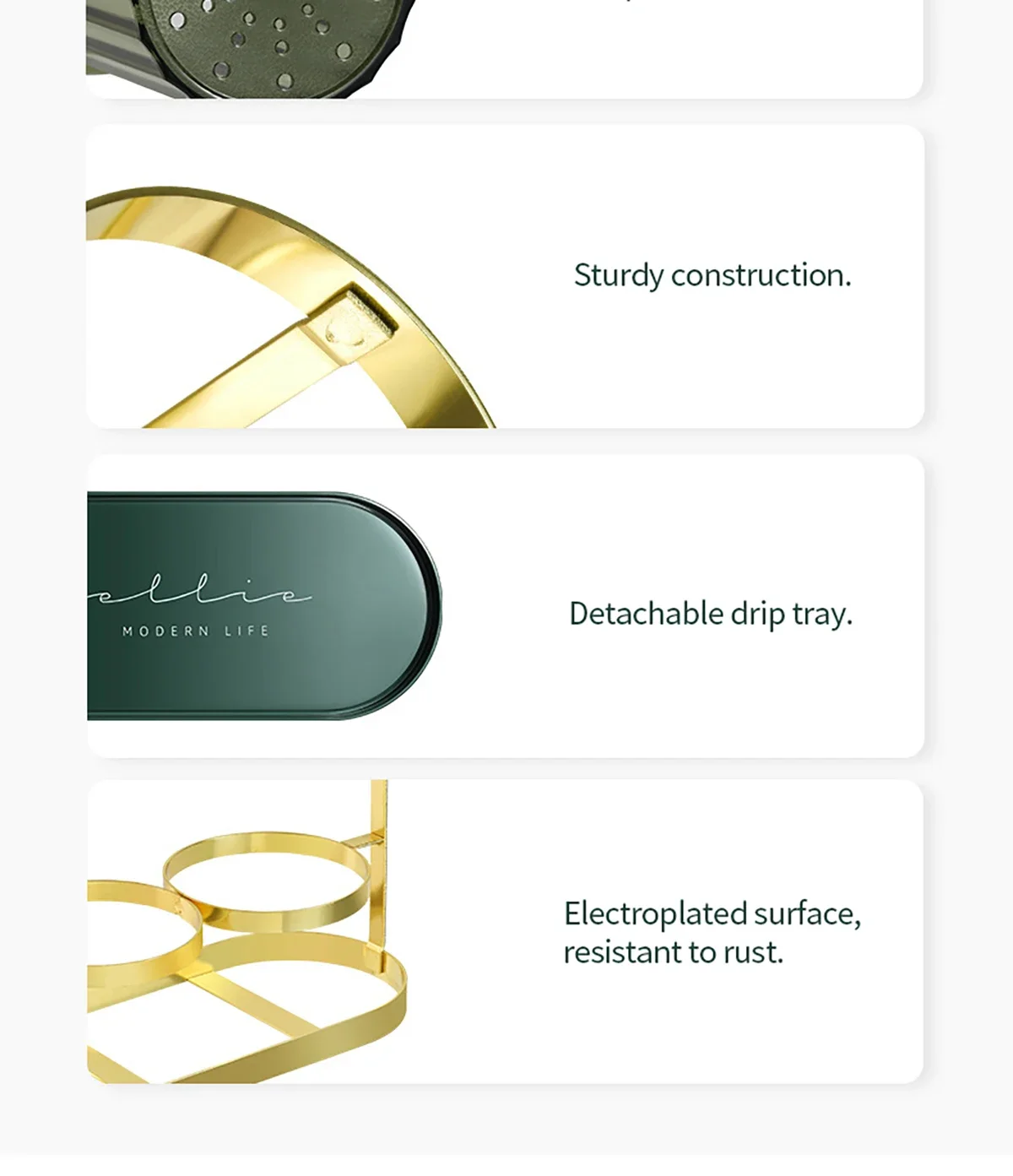 Solide Struktur & Hochwertiges Finish: Die Halterung besteht aus robustem Eisen mit einer rostbeständigen, plattierten Oberfläche, die für Langlebigkeit und eine ansprechende Optik sorgt (z. B. in Gold mit Dunkelgrün).